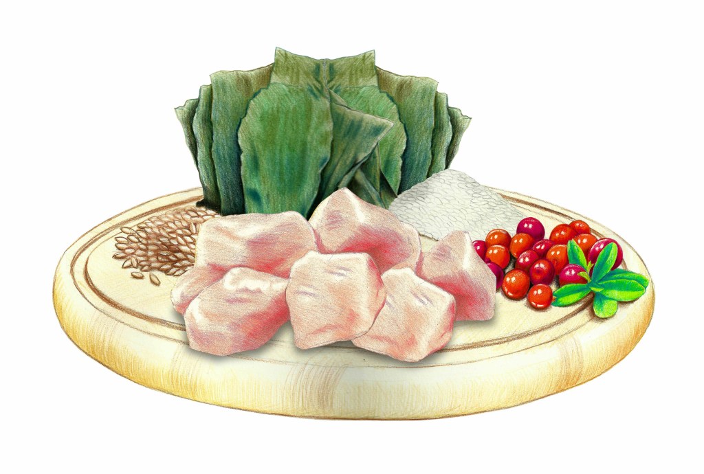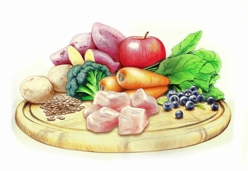 These hand-drawn mixed-media illustrations were created for Wellpet, a Japanese pet food company. Due to Japanese regulations, food ingredient depictions for pet products must use illustrations rather than photographs. I developed detailed, realistic artwork showcasing the fresh, wholesome ingredients used in their products.