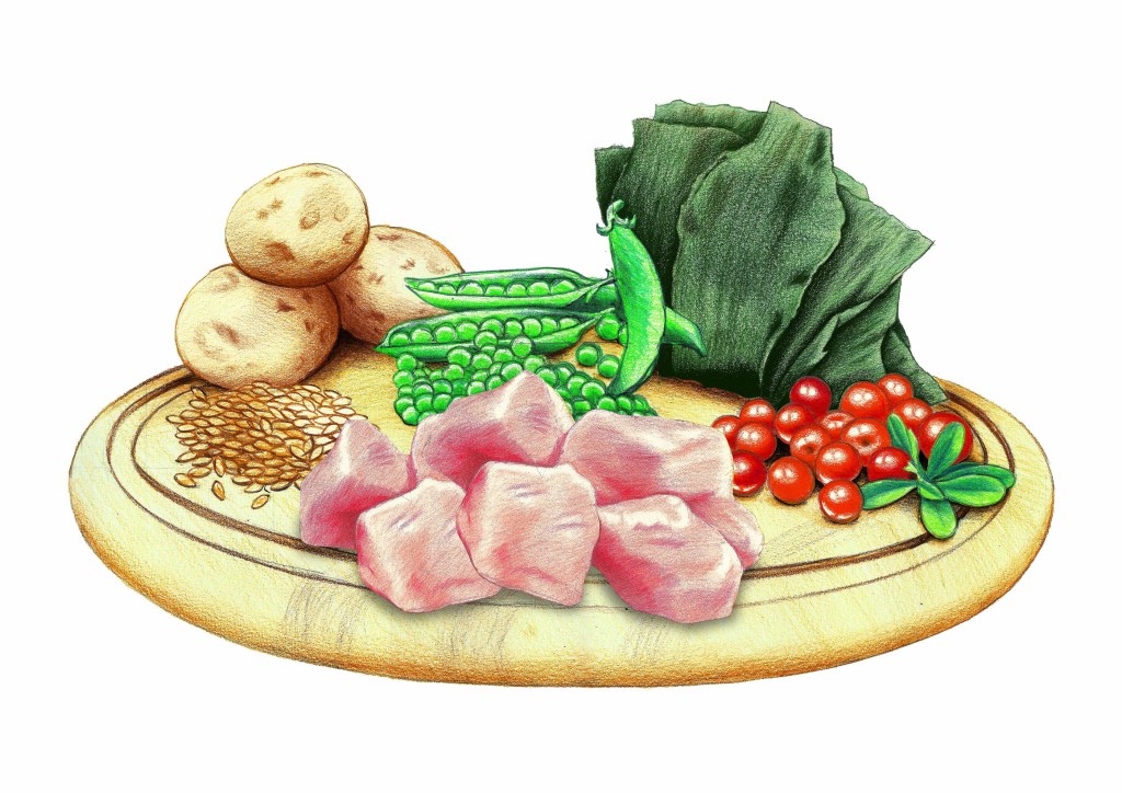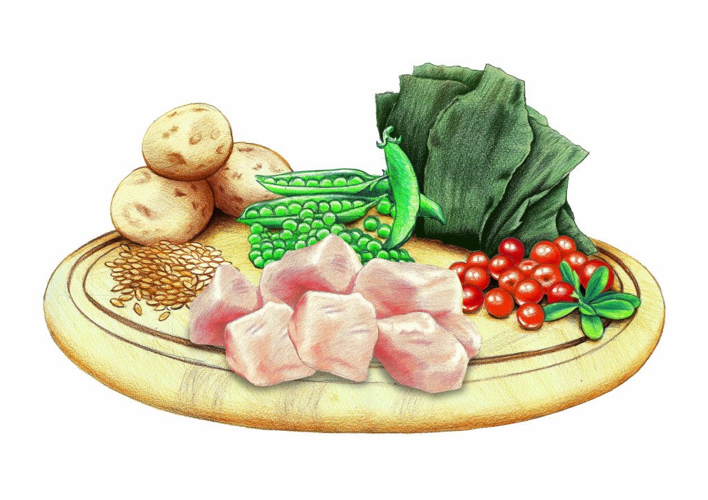 For Wellpet Japan, I created a series of mixed-media ingredient illustrations used as medallions on pet food packaging. Because Japanese regulations require illustrations instead of photos, each composition was designed like a small still life, highlighting proteins, vegetables, fruits, and grains in a fresh, appetizing way.