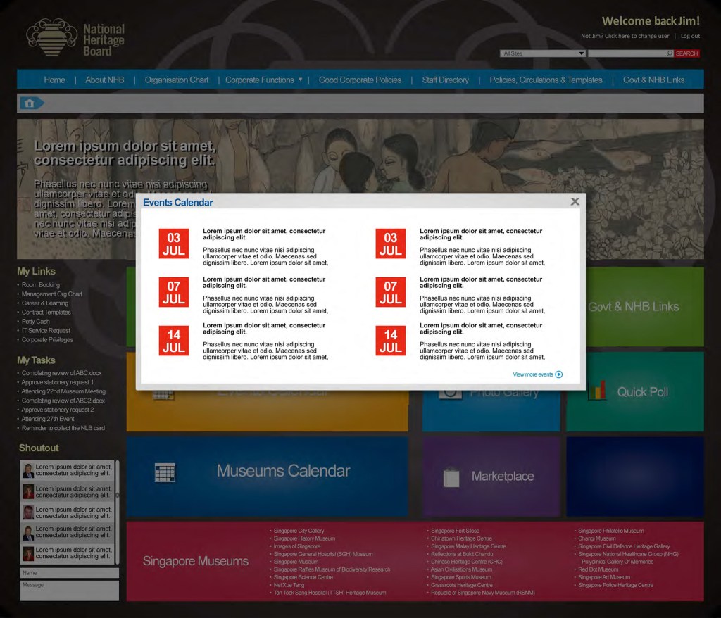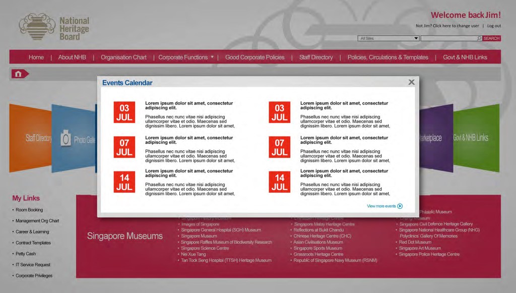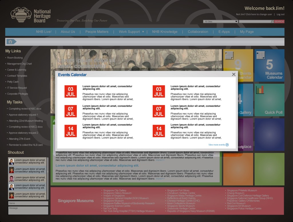 While at Total eBiz Solutions Pte Ltd, I was tasked with developing design proposals for the National Heritage Board of Singapore’s intranet portal. The challenge was to create a modern internal communication platform that was clear, user-friendly, and visually engaging, helping staff quickly access announcements, events, directories, and shared resources.